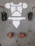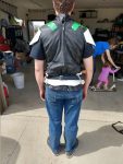 Here is a way you can make your own leather flak vest to hold your armour on. Use an old leather jacket, make sure it fits by wearing it backwards and having someone zip you up. If it is a tight fit then you can use it as a flak vest. Simply cut the sleeves off (keep some of the sleeve for attachment of your shoulder bells). Then attach armour using tape for spacing. Next you would form your armour with a heat gun, prime, metallic coat, paint, and weather before attaching velcro.