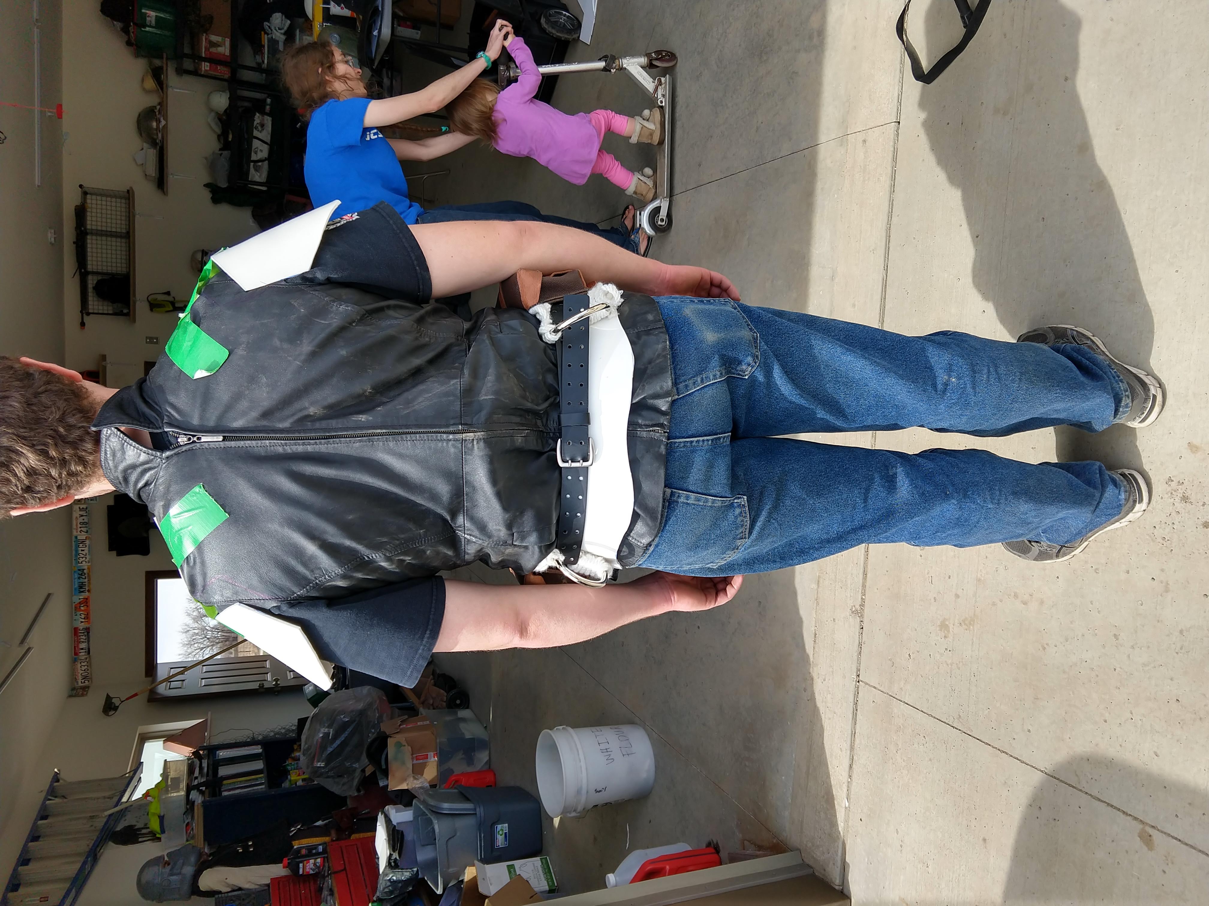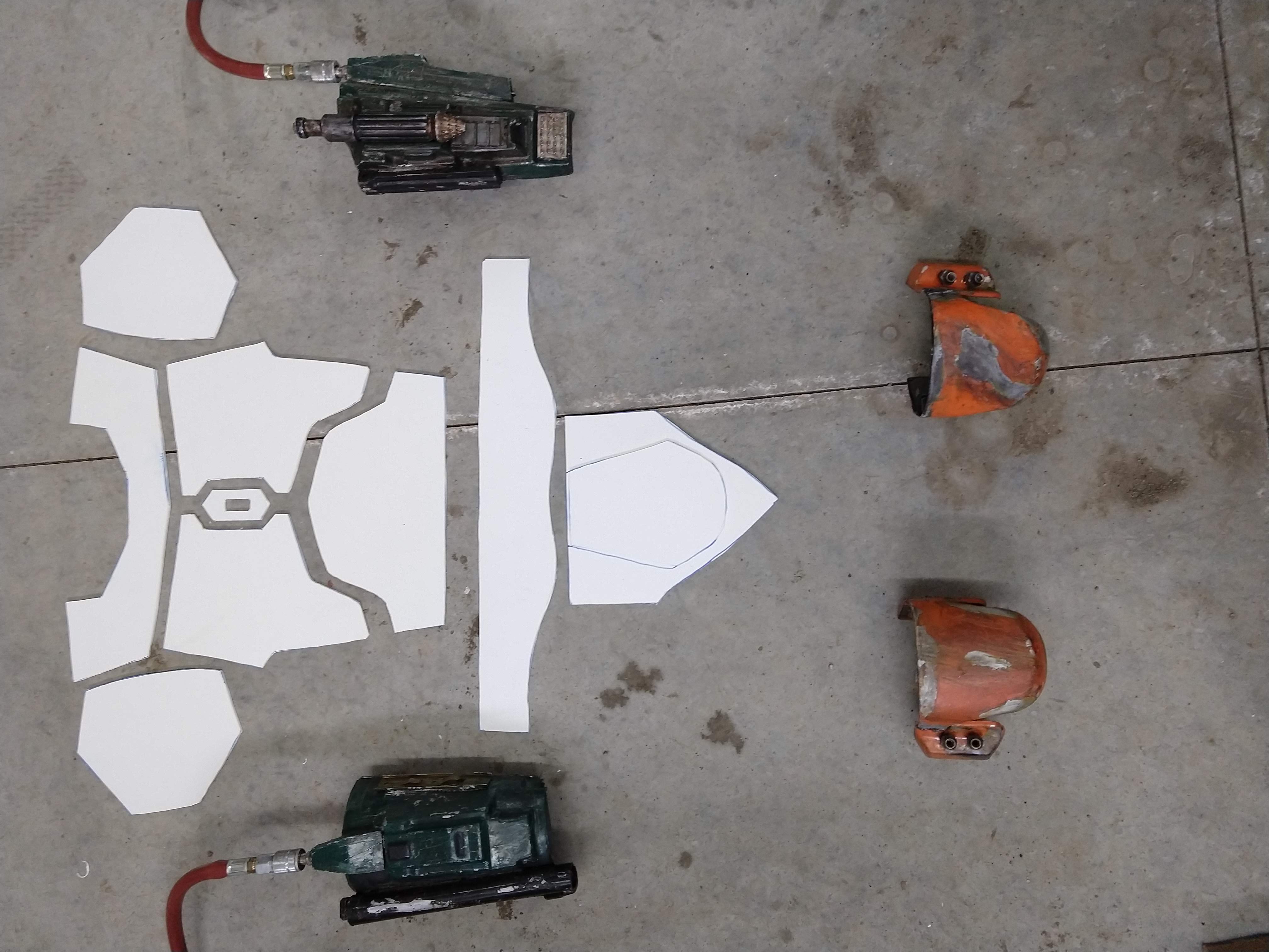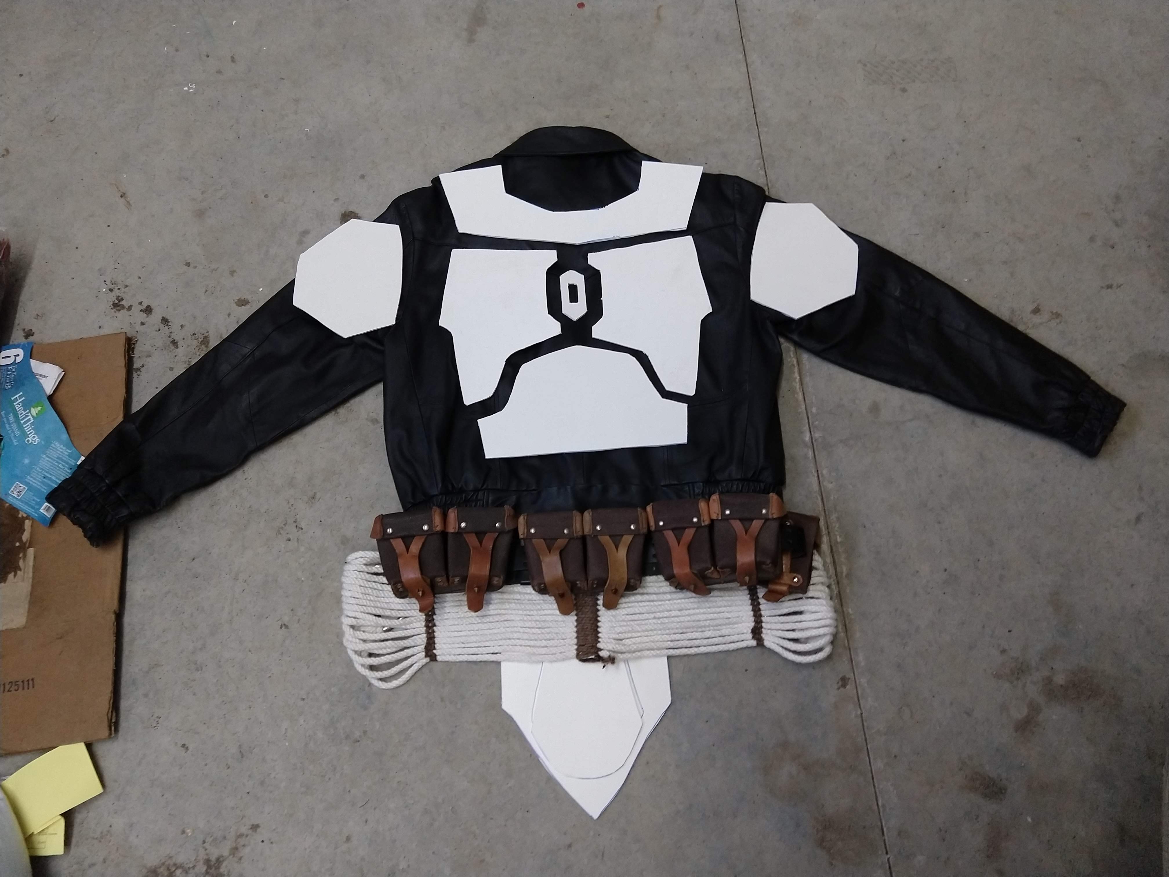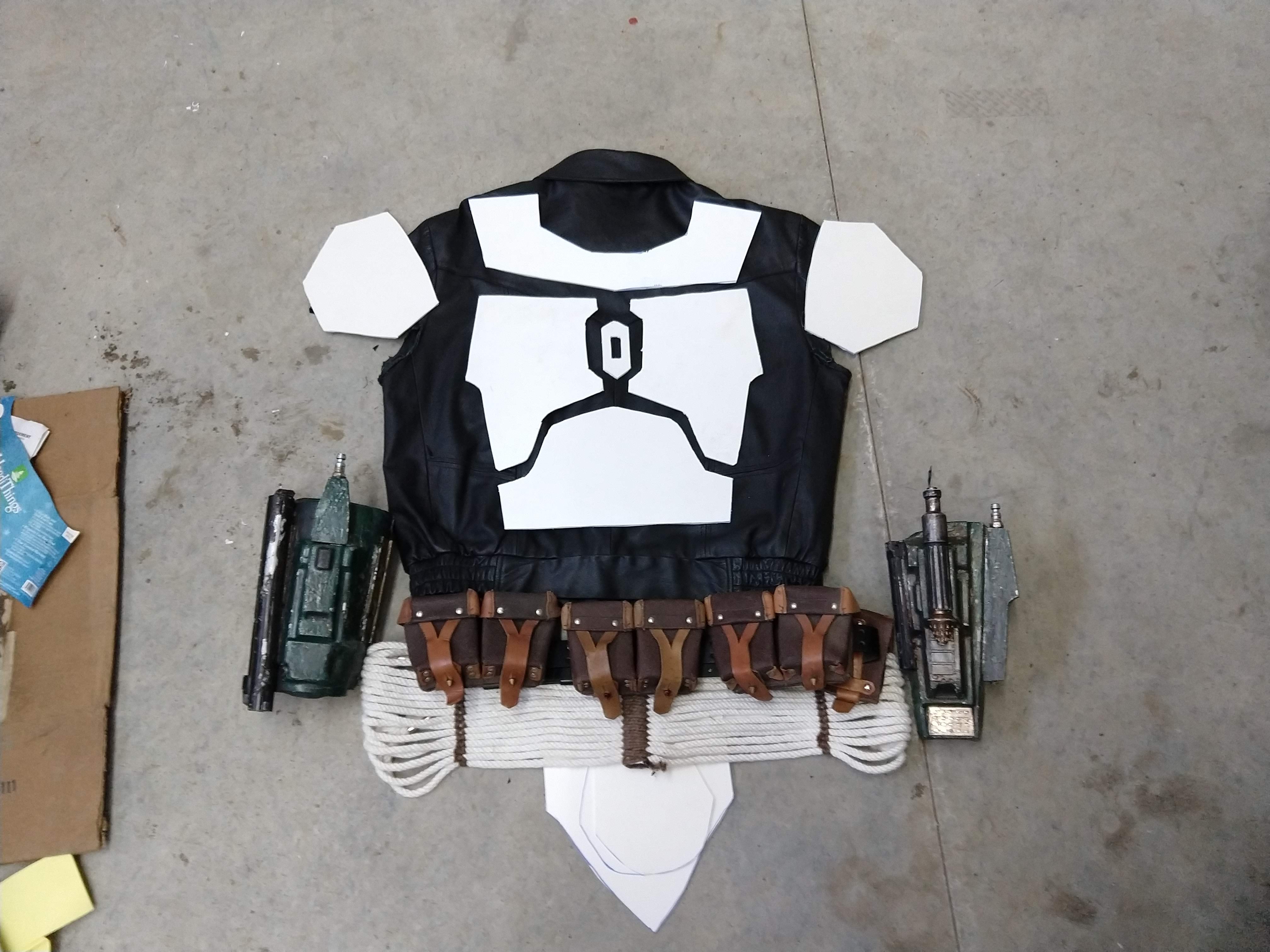 Here is a way you can make your own leather flak vest to hold your armour on. Use an old leather jacket, make sure it fits by wearing it backwards and having someone zip you up. If it is a tight fit then you can use it as a flak vest. Simply cut the sleeves off (keep some of the sleeve for attachment of your shoulder bells). Then attach armour using tape for spacing. Next you would form your armour with a heat gun, prime, metallic coat, paint, and weather before attaching velcro.